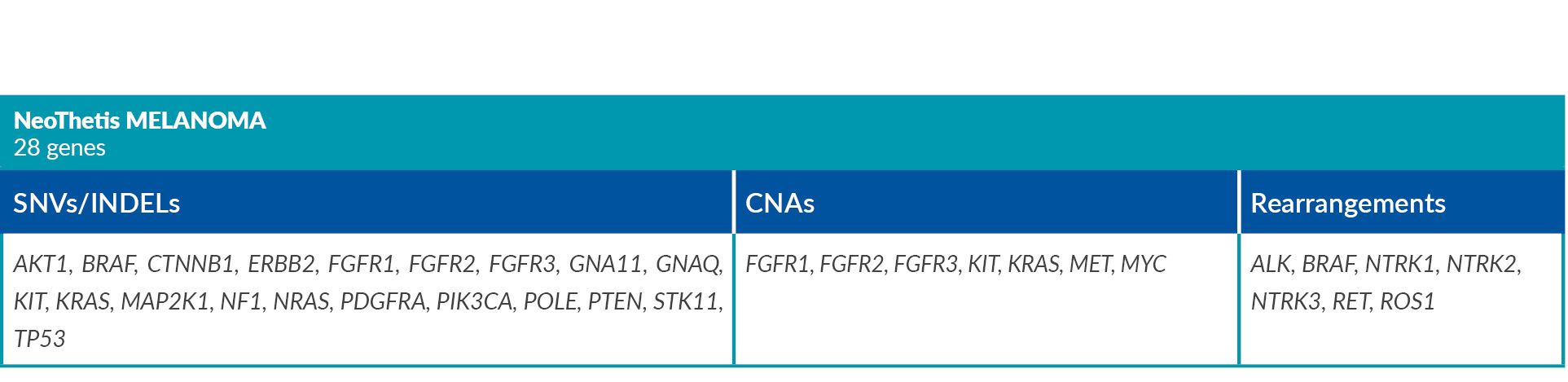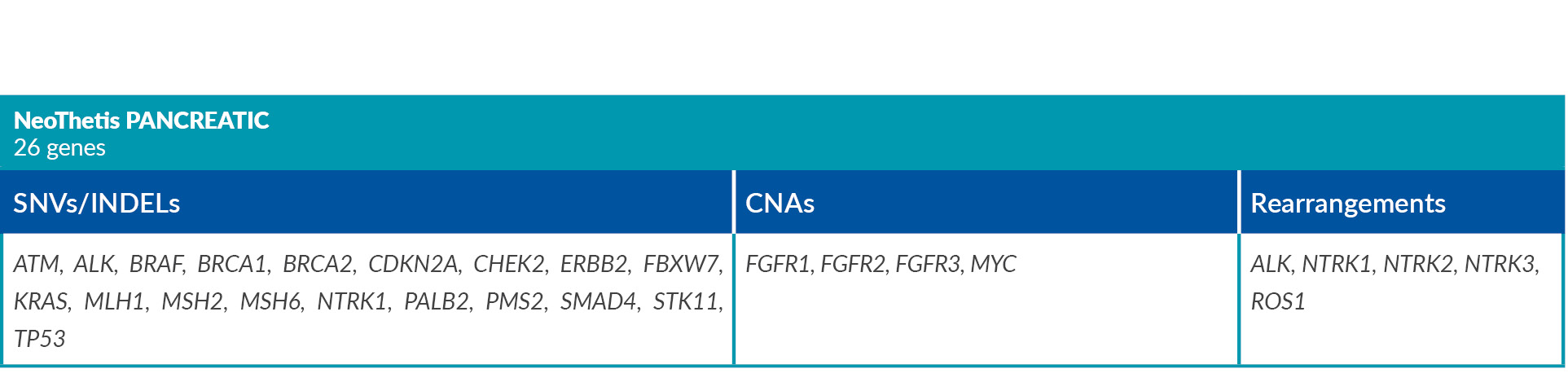 NeoThetis tests are designed to detect clinically actionable genetic alterations, including Single Nucleotide Variants (SNVs), Insertions and Deletions (INDELs), Copy Number Amplifications (CNAs), and Rearrangements, that drive cancer or are associated with response to treatment.
