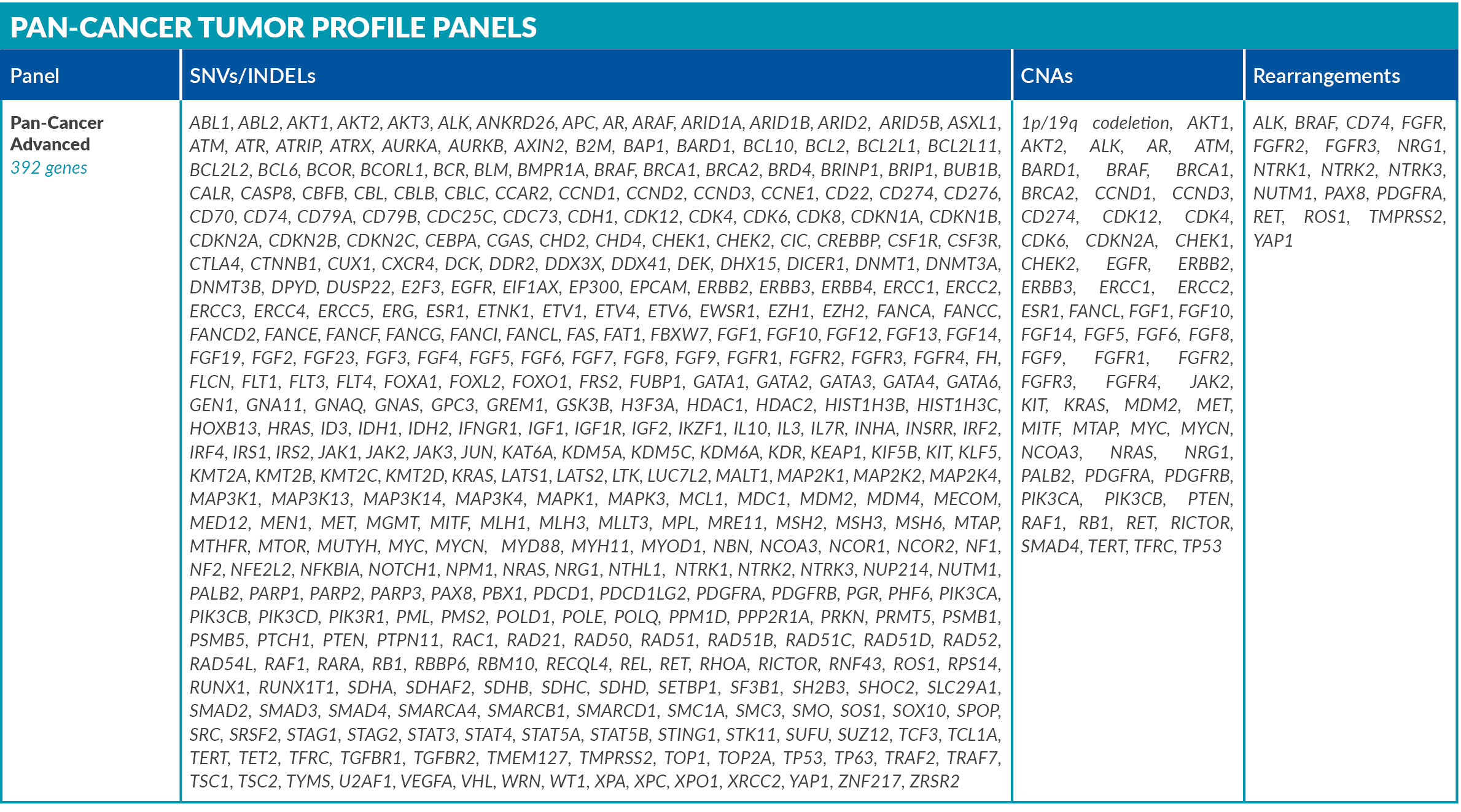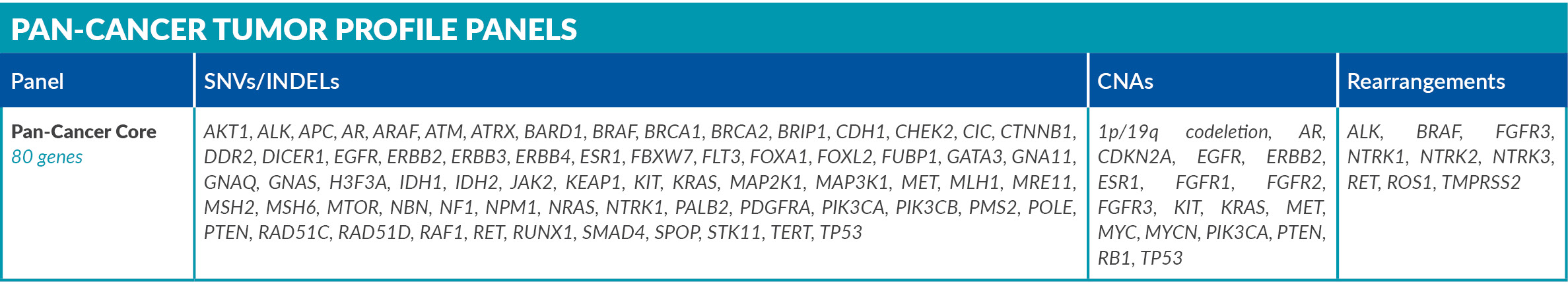 Genetic alterations tested include single nucleotide variants (SNVs), insertions and deletions (INDELs), copy number alterations (CNAs) and rearrangements.