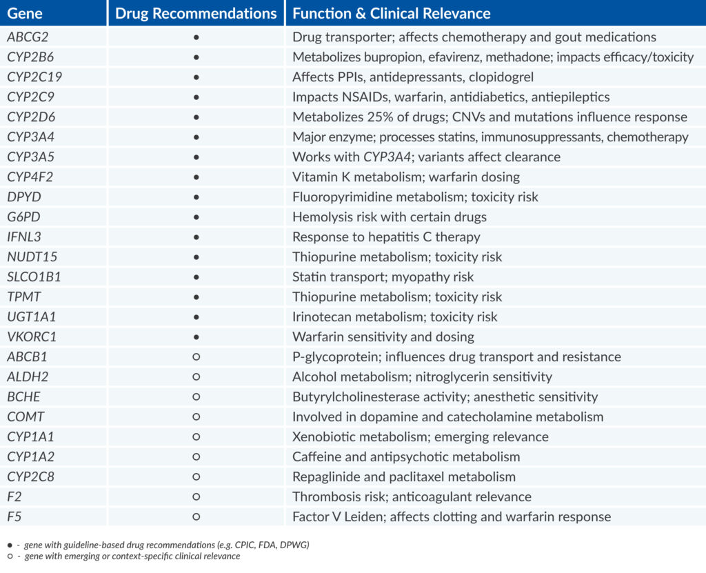 The panel is based on recommendations from leading pharmacogenomic societies3 and focuses on key genes involved in drug metabolism.